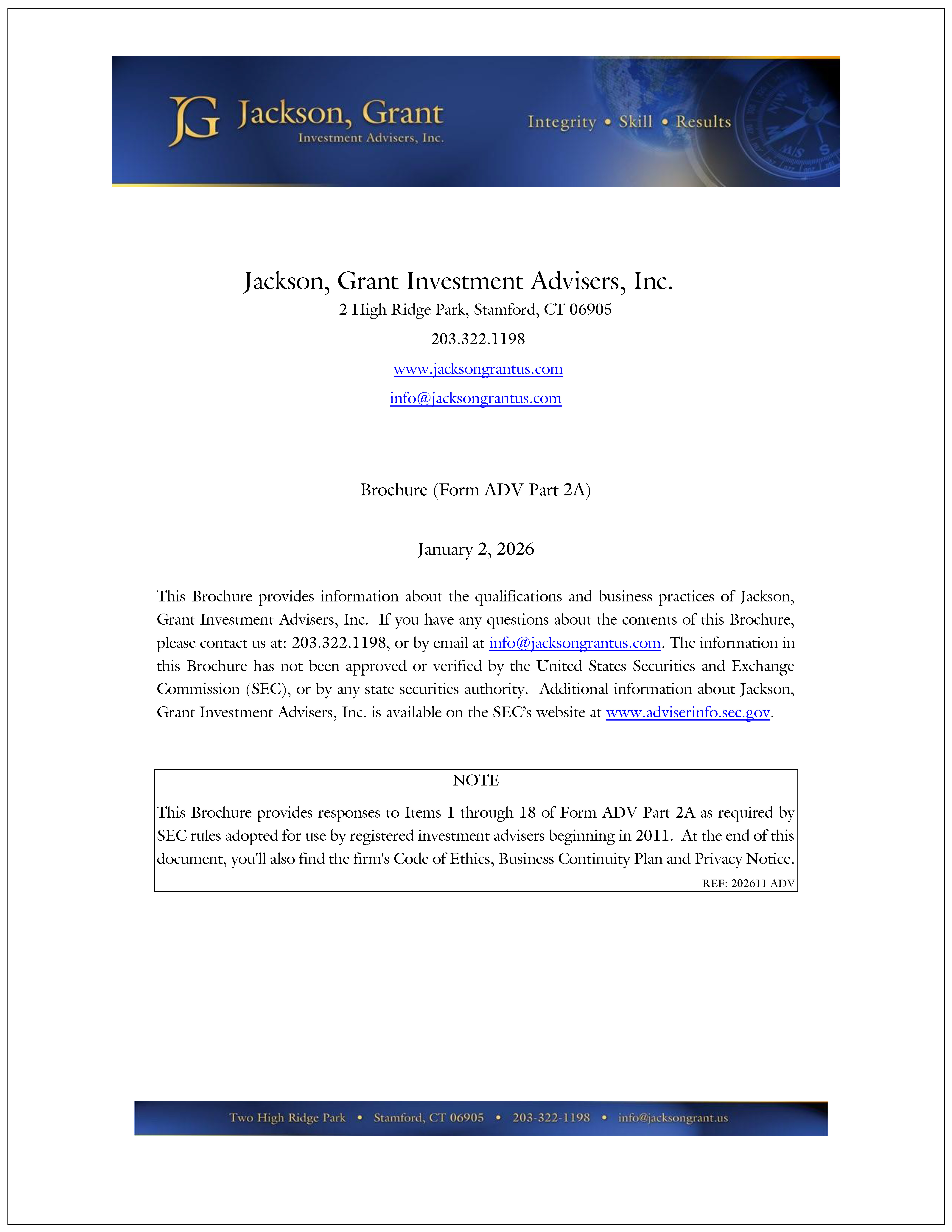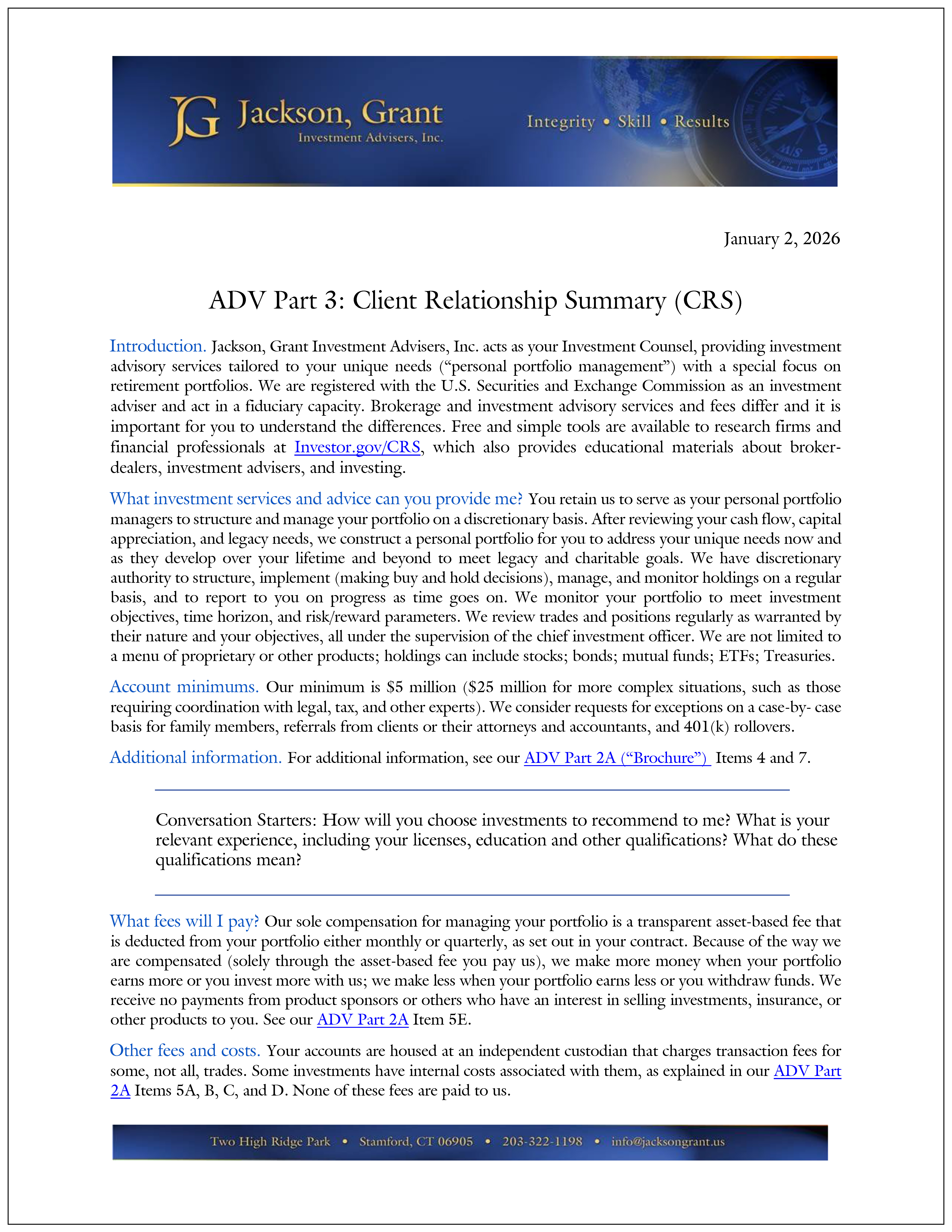 We are pleased to provide you with two important disclosure documents that are mandated by the U.S. Securities and Exchange Commission for firms such as ours that are regulated by the SEC. Clients will be familiar with the "Brochure" (also called ADV Part 2A). The second document is the Client Relationship Summary, or CRS. The CRS is a two-page document that follows a specific protocol uniformly applied to all registered investment advisers. We welcome any questions you may have about these disclosures.